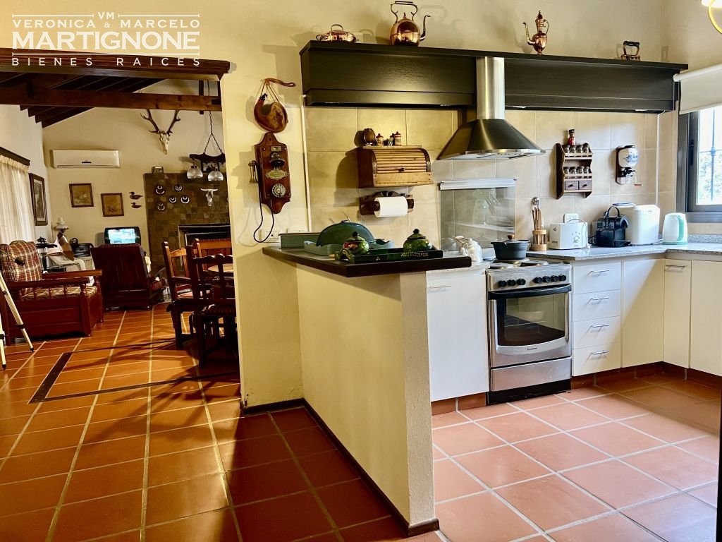 Cocina equipada con cocina eléctrica y cocina económica a leña, y comedor integrado.