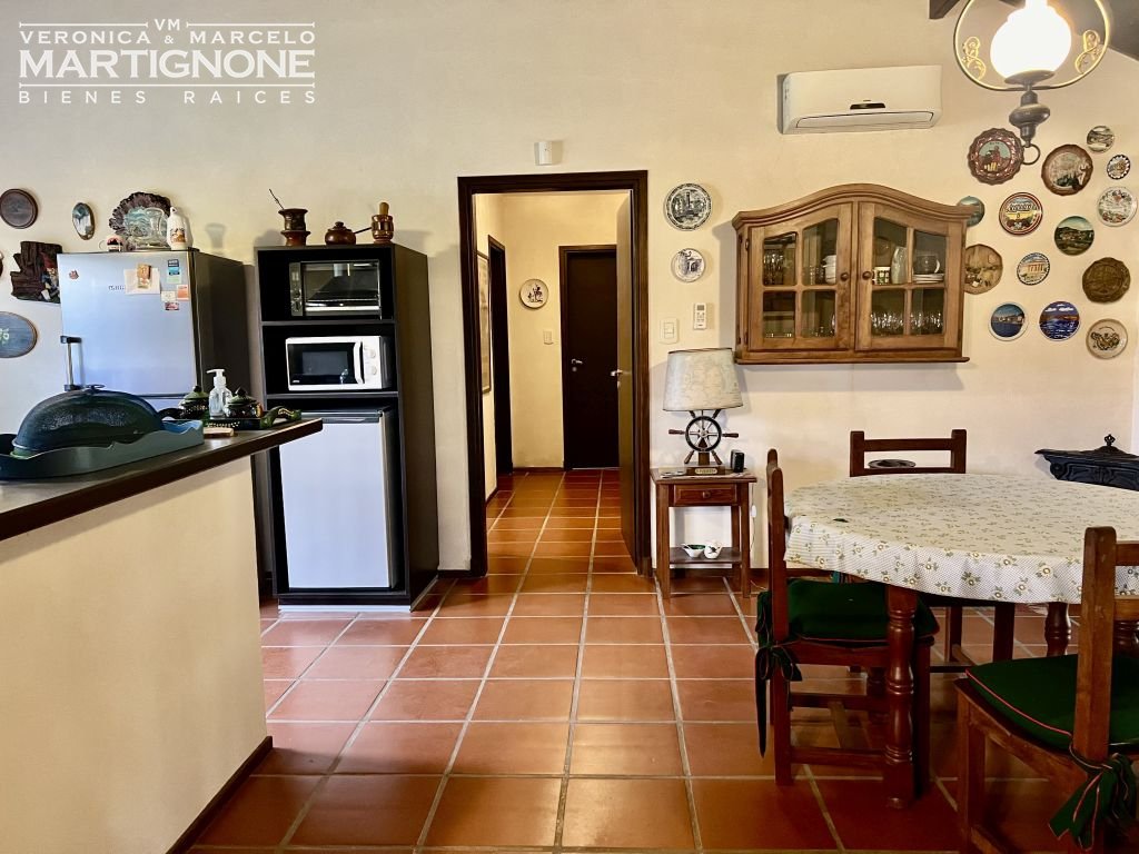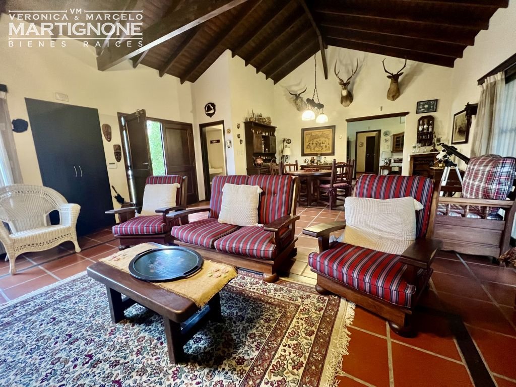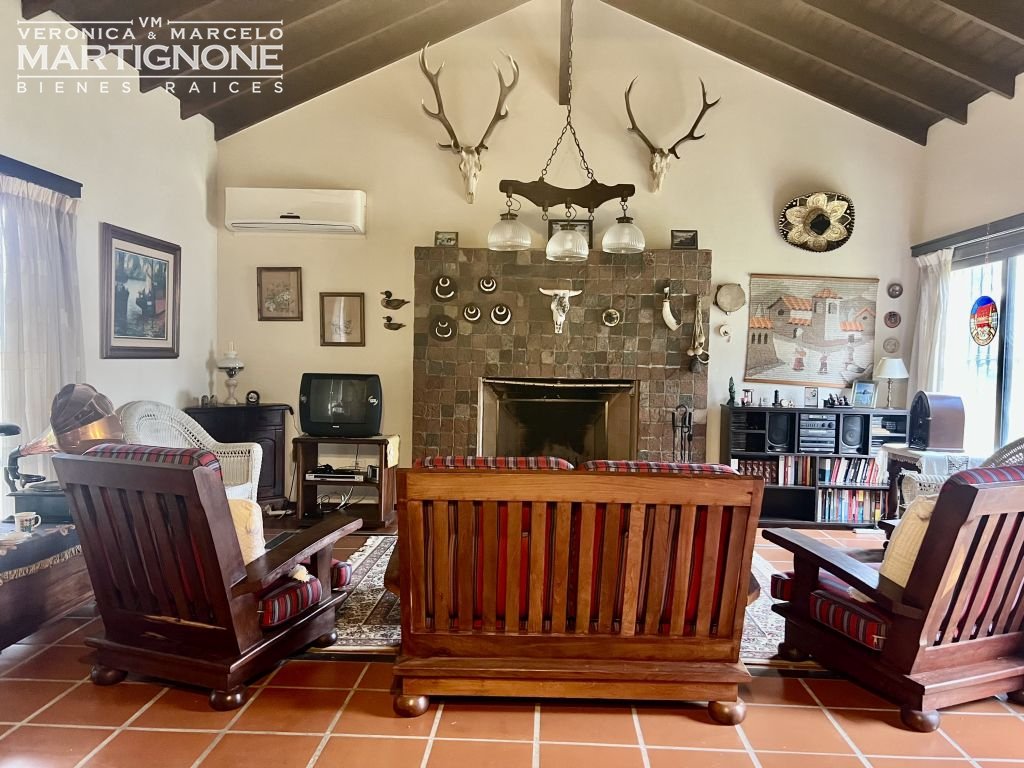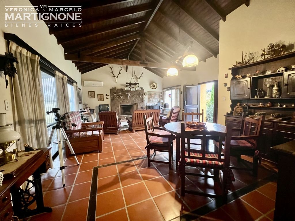 Living con hogar a leña y comedor.