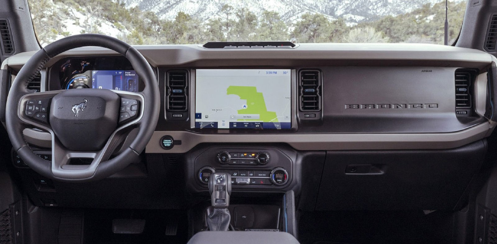 En el interior, la Bronco Wildtrak combina tecnología avanzada y comodidad, con un sistema de infoentretenimiento compatible con las últimas aplicaciones y funcionalidades. Esto se complementa con materiales resistentes y detalles diseñados para el uso todoterreno.